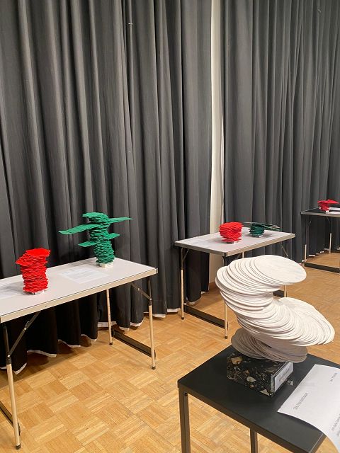 Unsere Werkstoffe waren zunächst Bierdeckel. Jeder versuchte sie zu stapeln und dabei Drehungen und Windungen einzubauen, ohne dass die Figuren umfielen – sie sollten „in Balance“ bleiben.