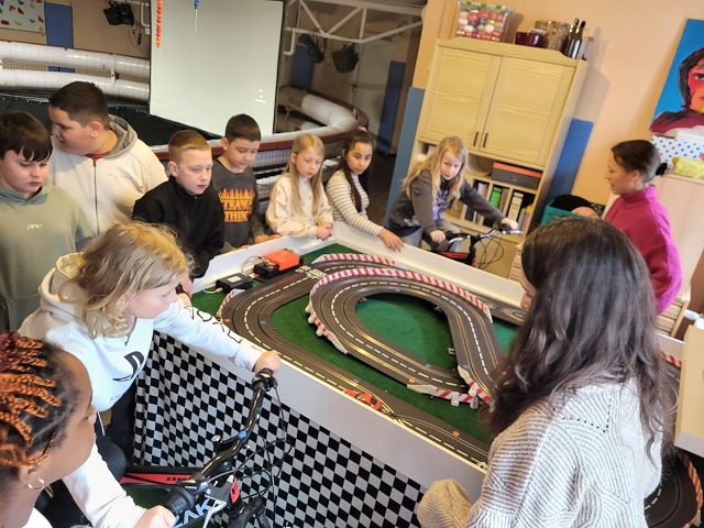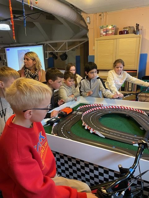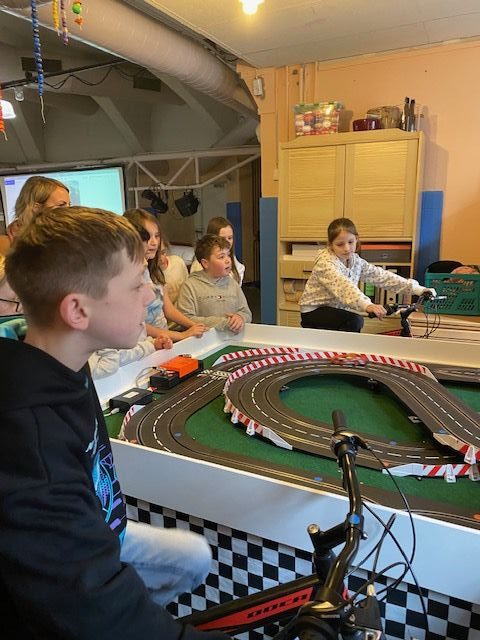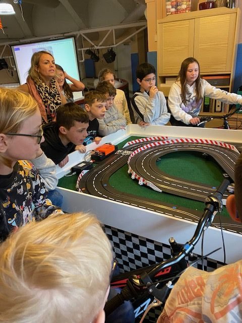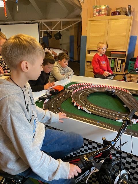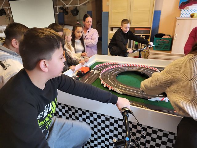 Das Besondere war jedoch, dass wir nicht einfach auf ein Knöpfchen drücken konnten, sondern mit Hilfe zweier Fahrräder und unserer eigenen Muskelkraft die Autos auf der Rennbahn antreiben mussten.