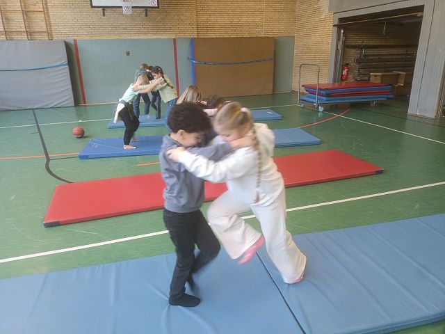 In der Rauf- und Rangelpause treffen sich jeden Dienstag und Mittwoch je acht Kinder in der Turnhalle. Unter der Anleitung von Herrn Radermacher wird hier, wie der Name schon sagt, gerauft und gerangelt. Nach genauen Regeln können die Schüler sich körperlich miteinander messen, einen fairen Umgang miteinander lernen und trainieren „Stop“ zu sagen.