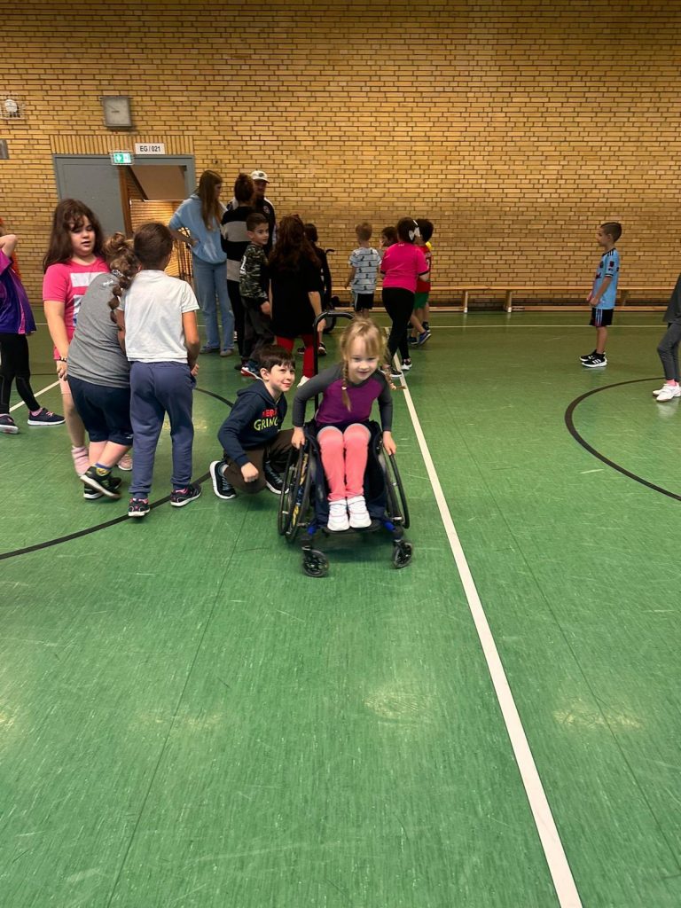 Wer wollte, durfte in einem Rolli Platz nehmen und nach kurzer Einweisung durch unsere Experten Elea und Leo eine Runde durch die Halle drehen.